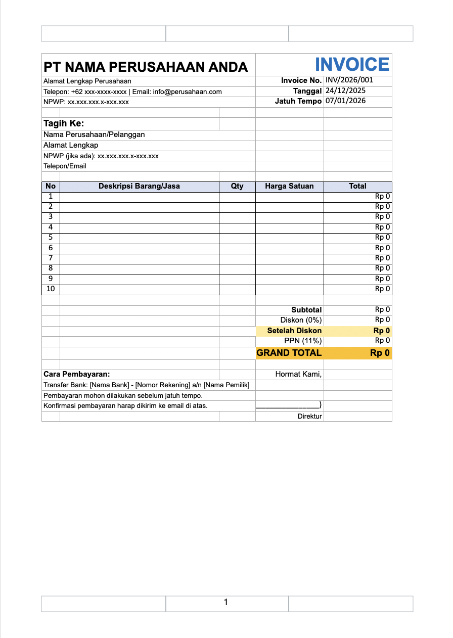 Excel adalah solusi gratis dan fleksibel untuk membuat invoice profesional. Dengan rumus otomatis, Anda bisa: