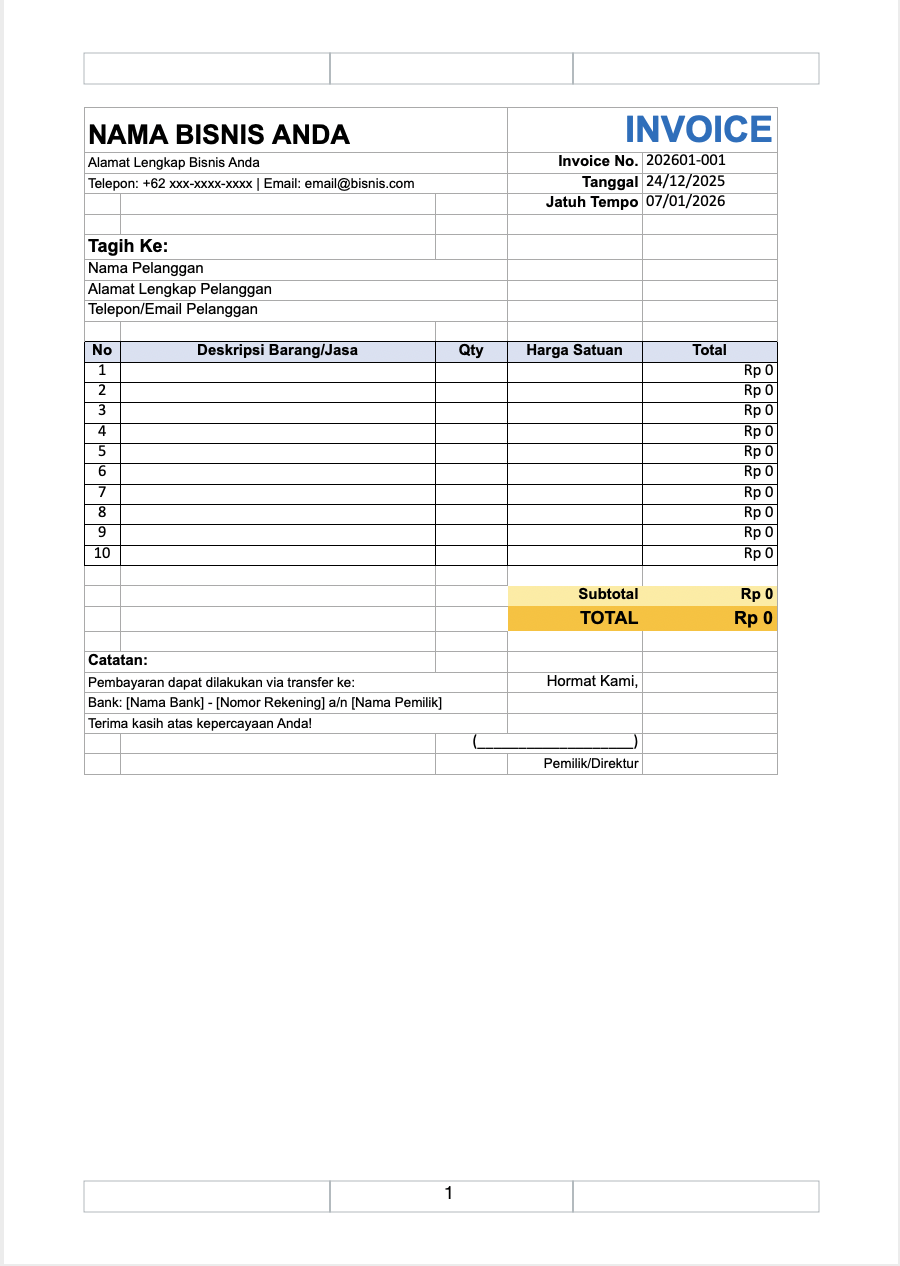 Solusi yang sudah dipakai jutaan orang: Buat invoice dengan Excel. Dengan rumus otomatis, Anda bisa membuat invoice profesional, perhitungan anti-error, dan format konsisten - tanpa kalkulator.